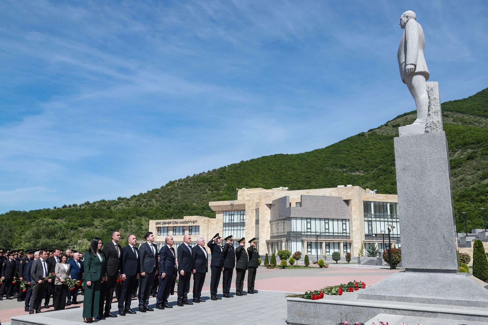 Şəki Şəhər İcra Hakimiyyətinin, YAP Şəki Rayon Təşkilatının rəhbərliyi, huquq-mühafizə orqanlarının rəhbərləri, ictimaiyyətin nümayəndələri Ulu Öndərin mərkəzin qarşısında ucaldılan abidəsi önünə gül-çiçək düzüb, xatirəsinə ehtiramlarını bildiriblər.